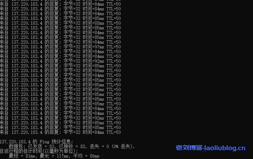 可以看到我本地延迟在86ms左右,而且网络还是非常稳的,基本没有丢包的情况。