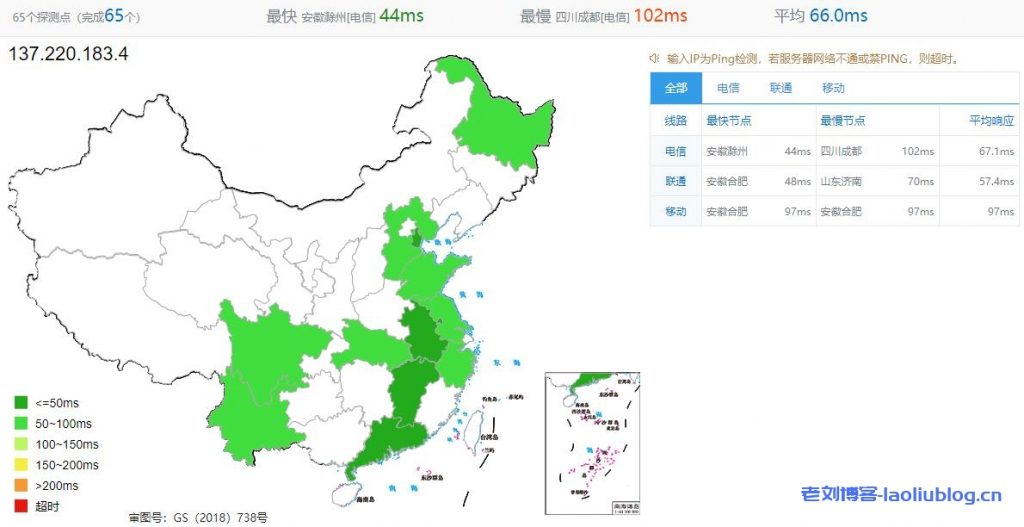 可以看到三网Ping的延迟在66ms左右,其中联通网络延迟是最好的只有57ms,然后是电信网络延迟是67ms,移动网络稍微差点延迟是97ms左右。