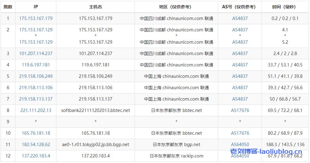 可以看到联通网络走的是AS4837路由线路,从上海网口出去后直连日本机房。