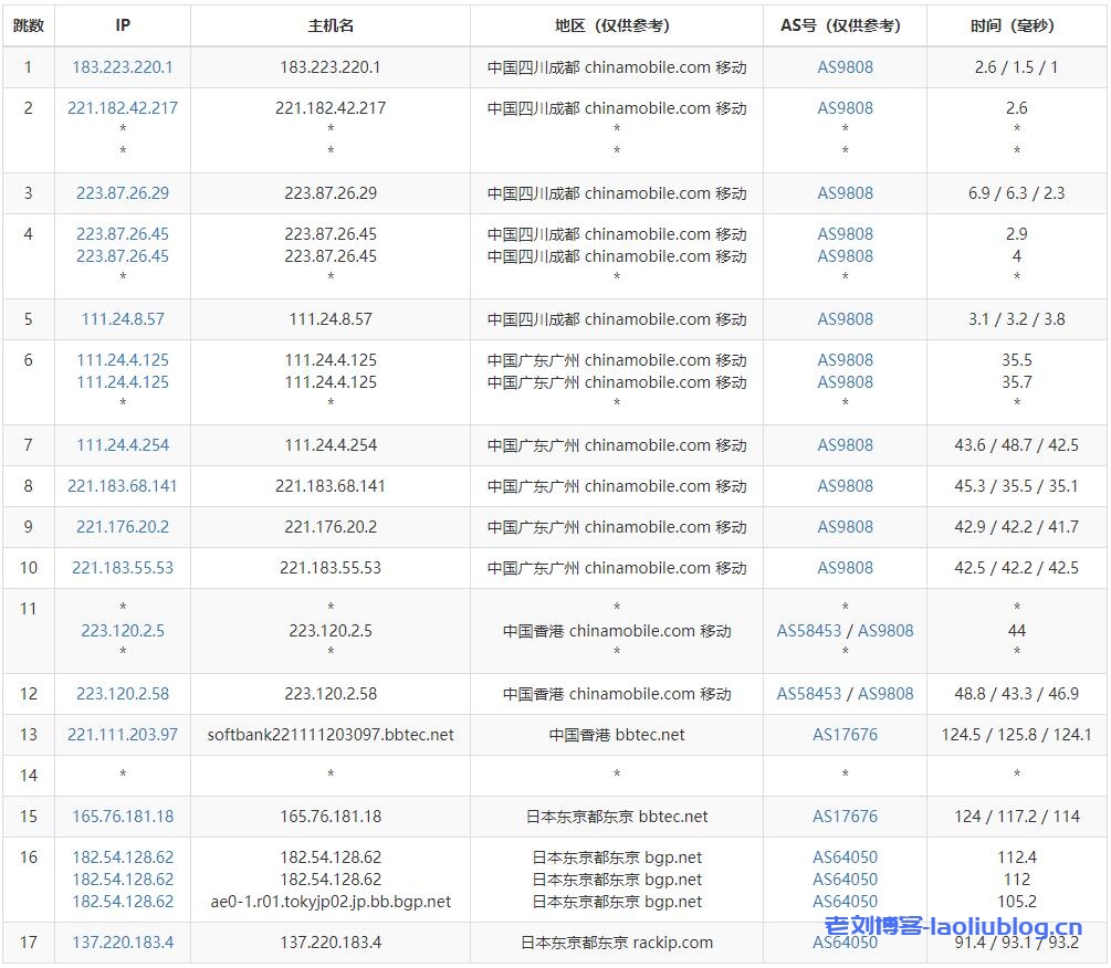 移动网络从广州网口出去后,先到香港机房,然后再转向的日本机房,相比起来线路比其他两种要差点。
