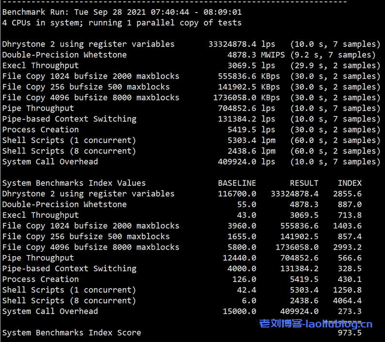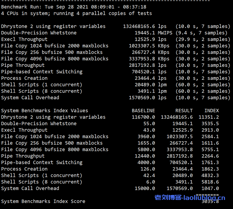最后看看Unix bench吧,单核973,4核3035,不算差吧,实际上这个核应该是超线程的核: