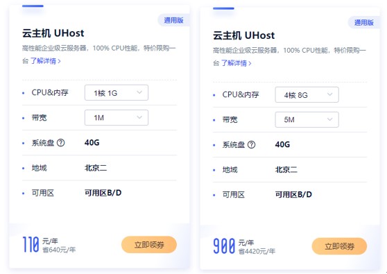 UCloud优刻得100% CPU性能北京高性能企业级云服务器,原价5320元/年,活动只要900元/年,4核8G 5M带宽。