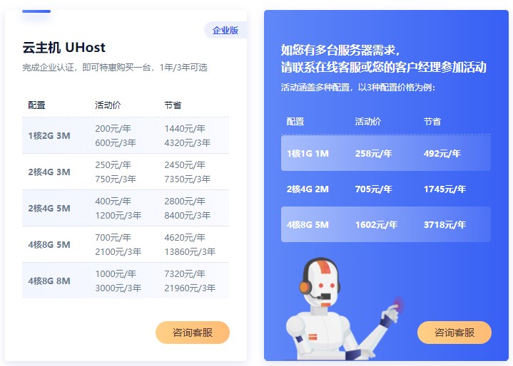 企业版本(活动支持企业用户购买)的UCloud云主机UHost,地域老刘咨询了UCloud客服人员,说也是国内北京的,注册了的UCloud账户只要完成了企业实名认证,就可以特惠购买一台云主机,有1年和3年可选择。下面的配置,活动价和原价对比价格差。前往UCloud云主机促销页面>>