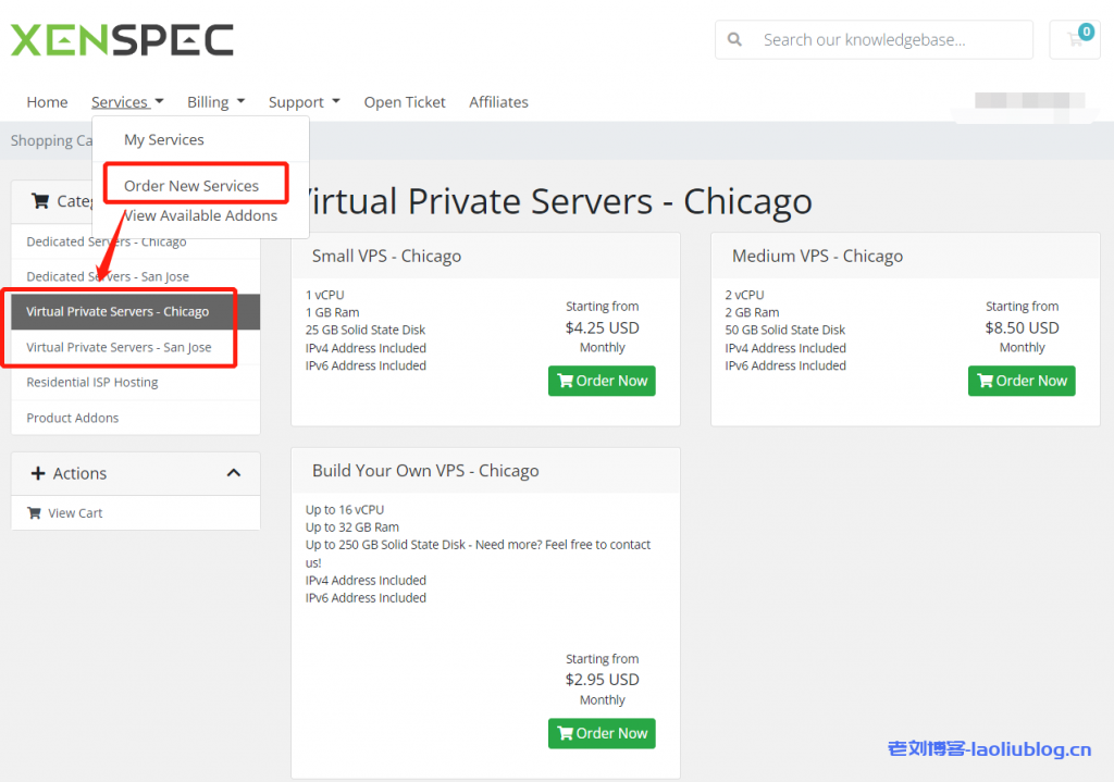 注册并登录账号→Services→Order New Services→Virtual Private Servers – Chicago或Virtual Private Servers – San Jose