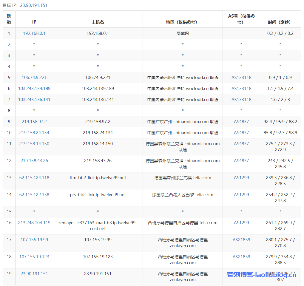 2、回程,到国内联通:走cogent从西班牙出来经过法国、德国再对接联通骨干回来;