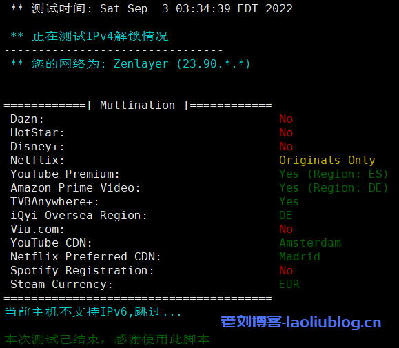 再来看看部分跨区域流媒体解锁测试结果: