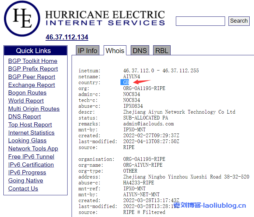 再次看下艾云iaclouds常规应用服务器Standard-V2是不是原生IP,结果显示确为英国原生IP:
