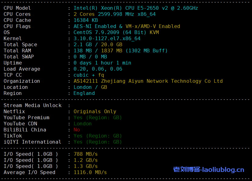 艾云iaclouds常规应用服务器Standard-V2配置信息,艾云网络英国原生IP,硬盘I/O高达1.3GB/s(平均1116MB/s),解锁英国TikTok。