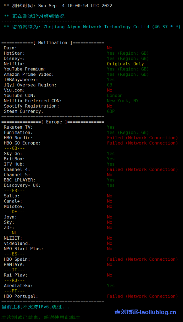 艾云iaclouds常规应用服务器Standard-V2其他流媒体解锁测试: