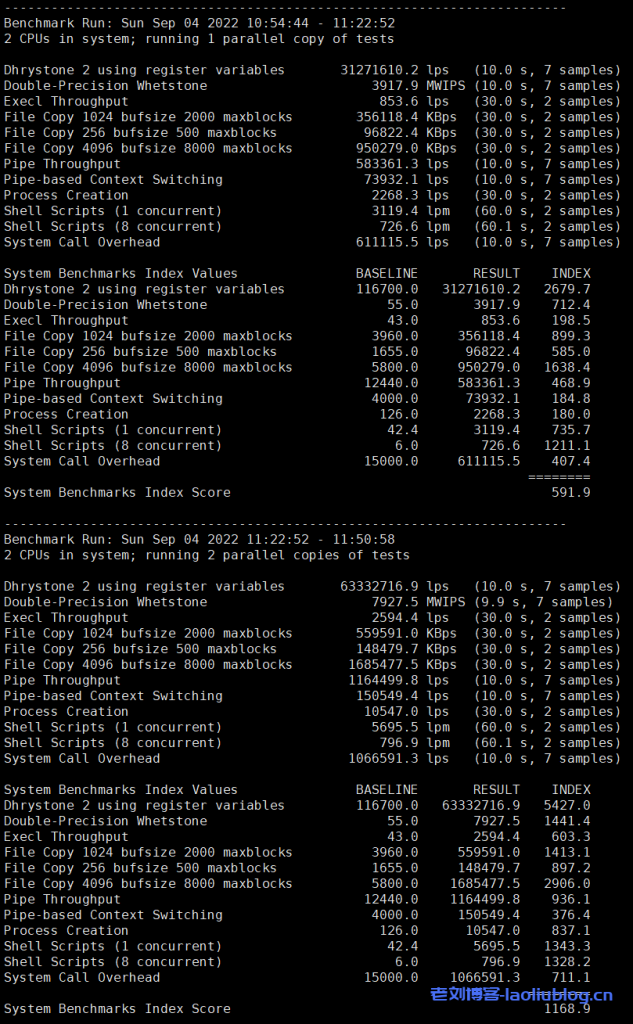 UnixBench脚本跑分单程491.9,双程1168.9。得分小于400的性能比较差、500-1000正常、大于1000优秀、大于2000极好。当然跑分不是认定机器好坏的唯一标准,需要综合考虑。这里跑分值属于优秀级别。