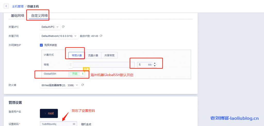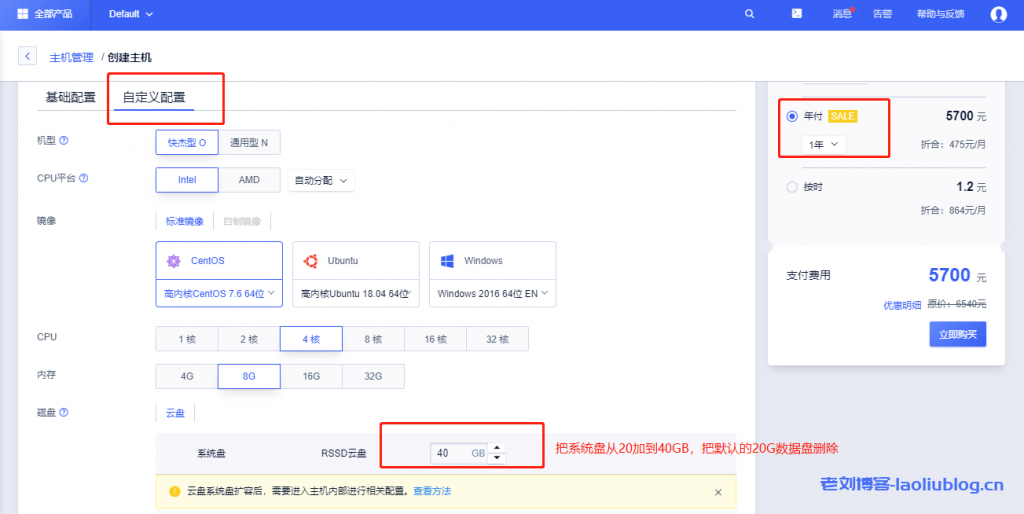 3,云主机配置选择:选择【自定义配置】,这里按活动页面要求的配置,我选择快杰型O,Intel CPU,标准镜像选择了Centos 7.6,4核CPU,8G内存,磁盘云盘系统盘40GB。带宽5M,选择带宽计费(这里海外机房UCloud默认开启了GlobalSSH),设置云主机服务器用户名和密码,选择1年付,点击【立即购买】;