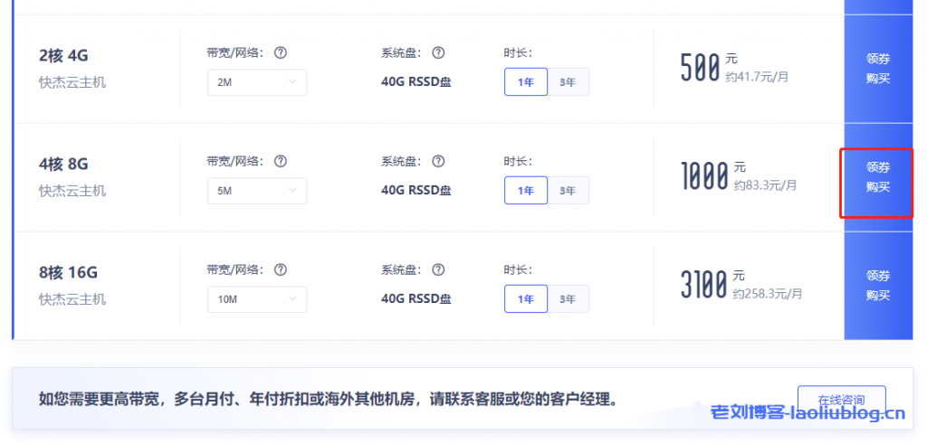 1,账号实名完成后,访问https://www.ucloud.cn/site/global.html,这里老刘选择了4核8G带宽5M的香港快杰云主机,1年付代金券,点击【领券购买】;