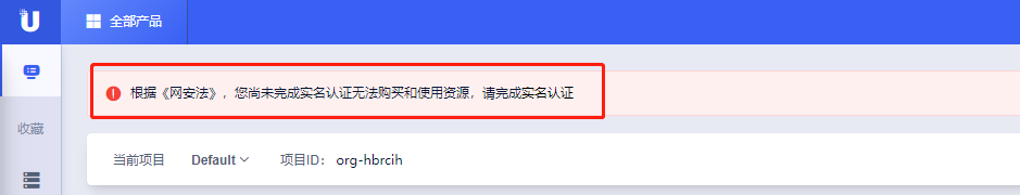 1,再次登录UCloud控制台https://console.ucloud.cn,这时如果账号依然是未实名的,会提示:根据《网安法》,您尚未完成实名认证无法购买和使用资源,请完成实名认证,所以想购买还是要实名的;