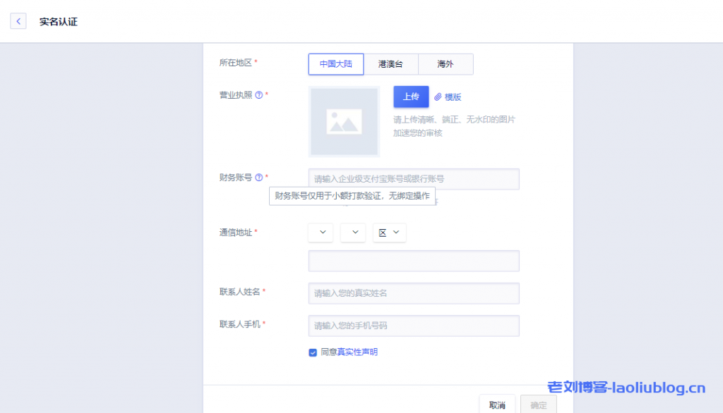 5,企业认证区分中国大陆,港澳台和海外用户。中国大陆企业用户上传营业执照,输入财税账号(仅用于小额打款验证,无绑定操作),通讯地址,联系人姓名和手机号,同意真实性声明,确认提交等待认证通过;