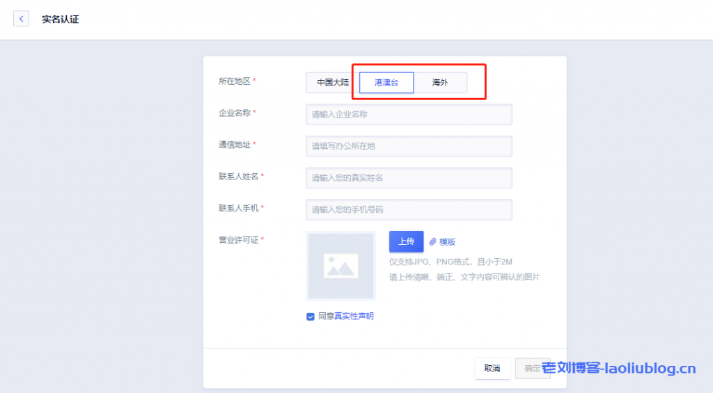 6,港澳台或海外企业用户输入企业名称,通信地址,联系人姓名和手机号,上传营业许可证(支持jpg,jpg格式,大小不超过2M),同意真实性声明,确认提交等待认证通过;