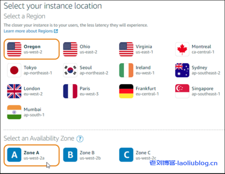 c.为您的实例选择 AWS 区域和可用区。