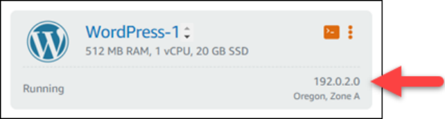 在地址中,将 PublicIpAddress 替换为 WordPress 实例的公有 IP 地址。您可以从 Lightsail 控制台获取实例的公有 IP 地址,如下图所示: