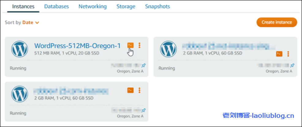 a.在 Lightsail 主页的 实例选项卡上,选择正在运行的 WordPress 实例。