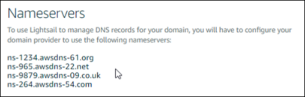 您可以将这些名称服务器地址添加到您的域名注册商,以将对域的 DNS 记录的管理权限转移到 Lightsail。