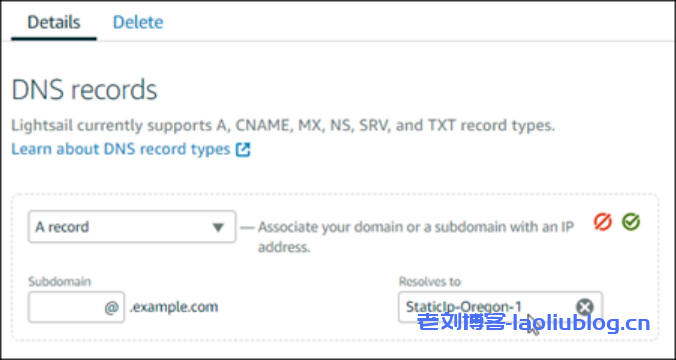 d.将域的 DNS 记录的管理权限转移到 Lightsail 之后,添加一个 A 记录以将域的顶级域名指向 WordPress 实例,如下所示:
