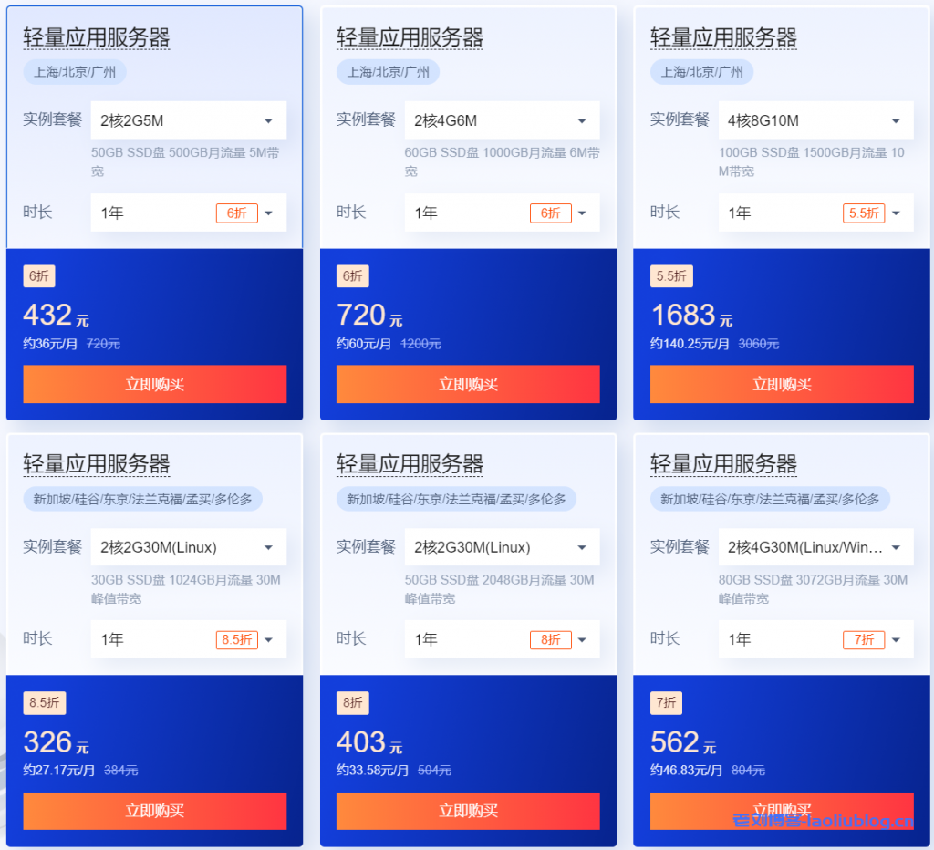 轻量应用服务器,上海/北京/广州,2核4G6M,60GB SSD盘 1000GB月流量 6M带宽,720元/年;