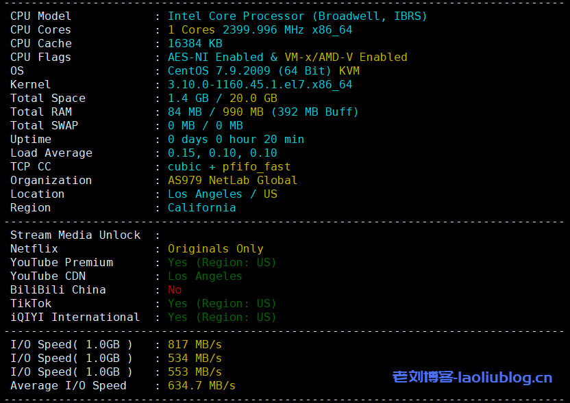 配置信息情况;TikTok检测结果:支持解锁美区TikTok;磁盘IO在634.7MB/s