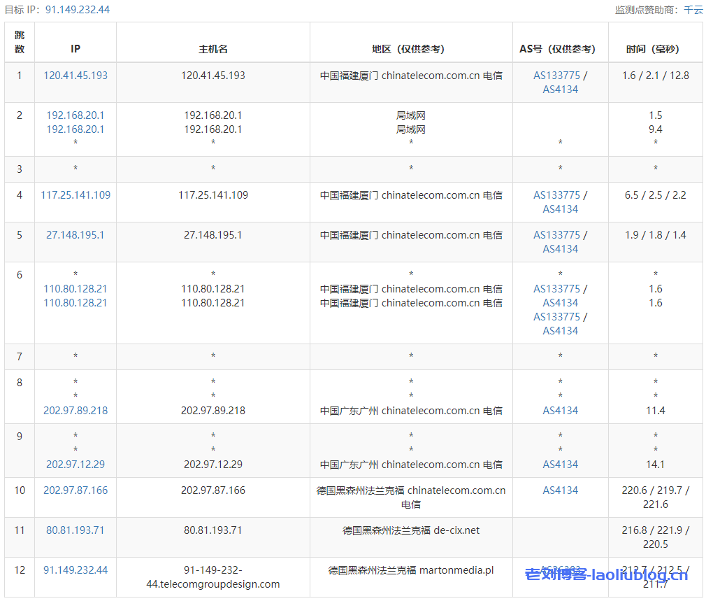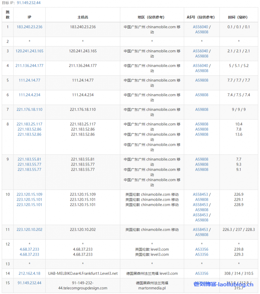 回程,到国内移动:北京/广州方向:走level3在法兰克福转移动节点直连回国;上海方向:走NTT从德国到奥地利然后到新加坡再回国。
