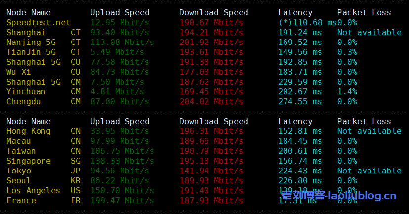 VPS是否好用,在国内能跑多少的上下行带宽是个很重要的参考参数,我们用speedtest.net的不同节点跑一下看看: