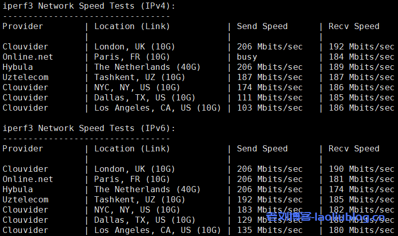 再用iperf3跑几个欧美节点来看看,这里也明显看到是带IPv6的