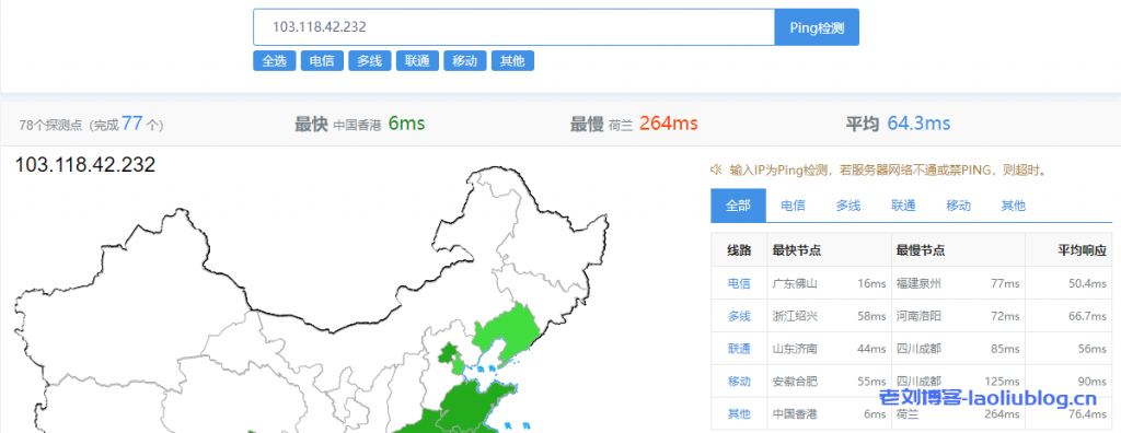 国内77个节点的延迟测试:
