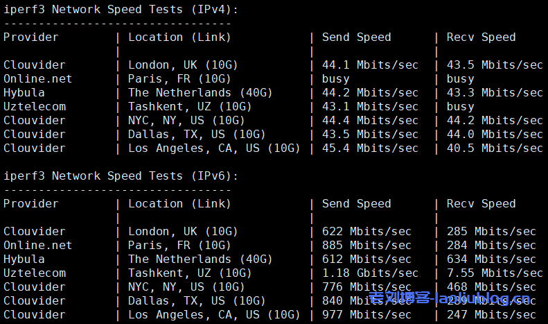 iperf3跑欧美的节点,大致数据如下(IPv4、IPv6都有了,这款机器是有1个IPv4和25个IPv6):