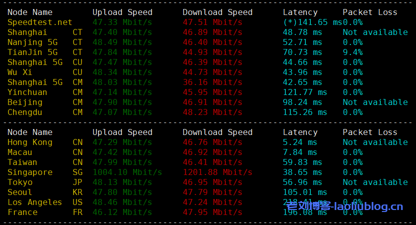 站长开的是50Mbps带宽的香港VPS,用speedtest.net在国内的节点跑一把,看看上行和下行的带宽能跑到什么样子?大致数据如下: