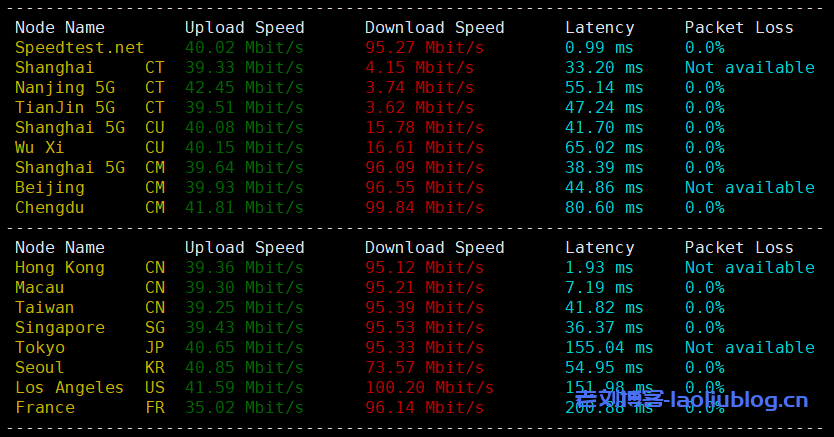 站长开的是30Mbps带宽的香港VPS,用speedtest.net在国内的节点跑一把,看看上行和下行的带宽能跑到什么样子?大致数据如下: