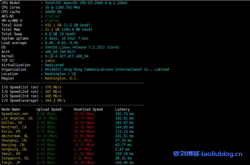 可以看到这款香港站群服务器采用E5-2660处理器,主频2.2GHz,磁盘I/O在384MB/秒,性能是相当可以的。国内和全球各地上传和下载速度都跑满了10Mbps,因为我这个服务器选择的是10Mbps的带宽,所以最大带宽是跑满了的,你可以自定义选择需要的带宽。