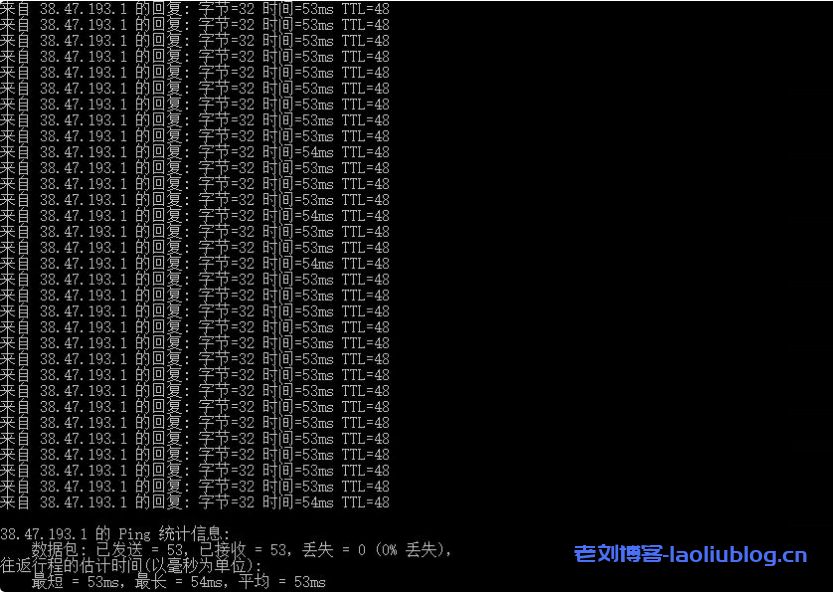 可以看到我本地Ping的延迟在53ms左右,这个延迟对于香港机房来说还是相当不错的,如果你在东南地区,那么这个延迟还会更低。可以看到网络是相当稳定的,基本都没有丢包的情况。