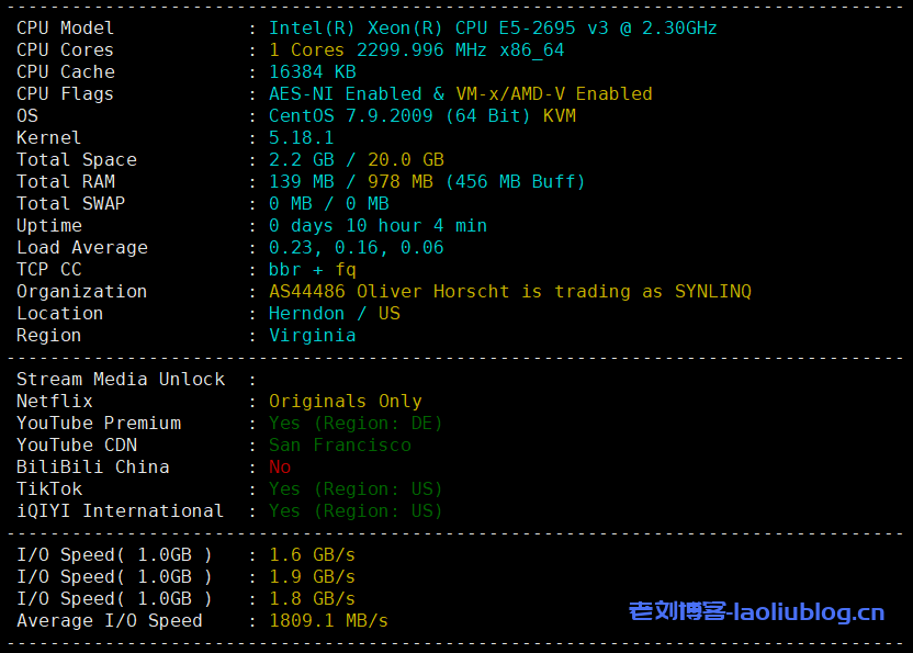 CPU为e5-2695v3,2.3GHz的主频,机器自带默认开启了BBR加速,当前I/O读写速度达到1.8GB/s,支持解锁美区TikTok流媒体