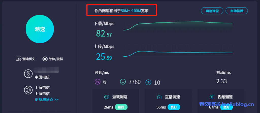 站长家里用的带宽是电信100M(用起来很垃圾),如图是测速网测的网速情况,这还是站长靠近路由器1米内的结果