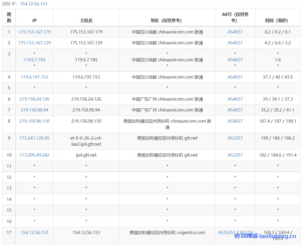10 120.83.0.234 157.74 ms AS17816 China, Guangdong, Guangzhou, ChinaUnicom