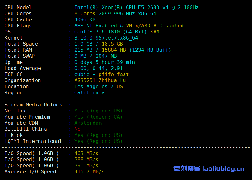 CPU是Intel E5-2683 V4 @2.10GHz;开设在美国洛杉矶机房,是美国原生IP VPS;支持解锁美区奈菲视频,解锁美区TikTok流媒体;磁盘I/O读取速度415.7MB/s