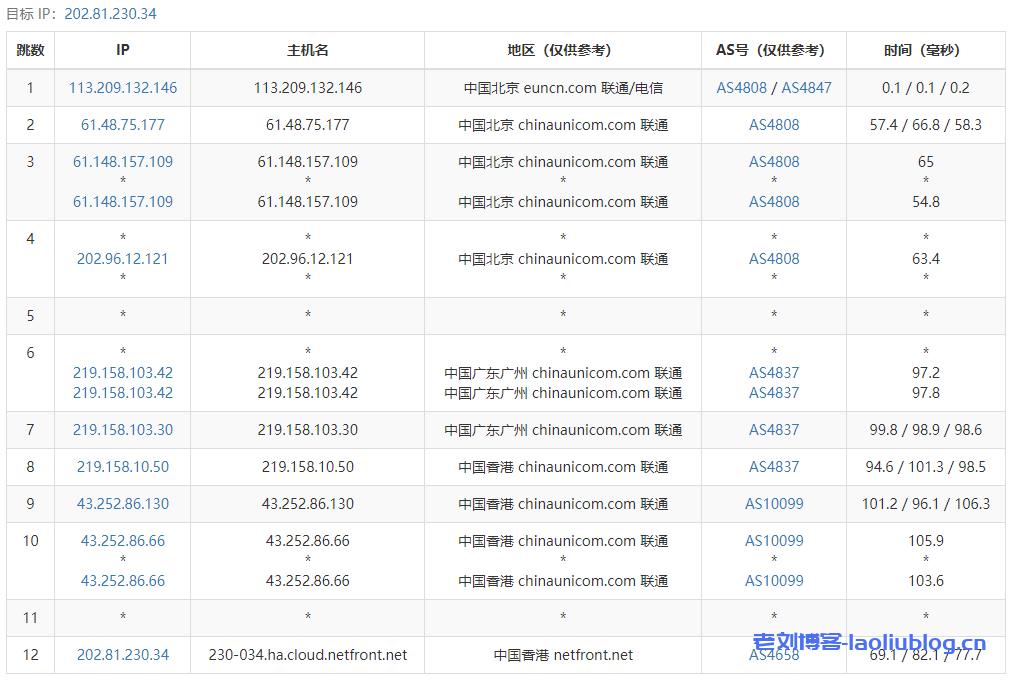 10 61.51.169.174 45.75 ms AS4808 China, Beijing, ChinaUnicom