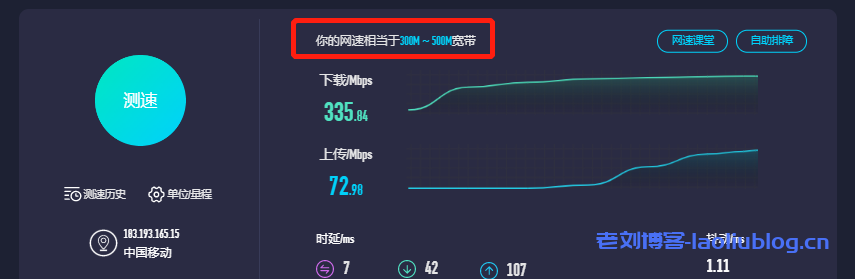 上海带宽经测试大概300-500M移动带宽,实际老刘装的是1000M带宽