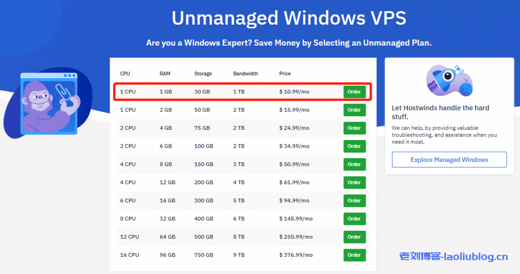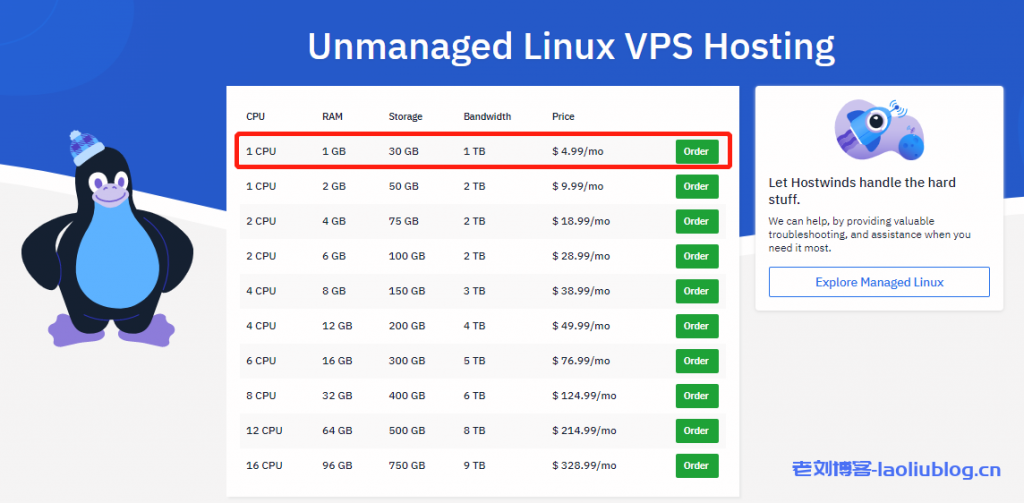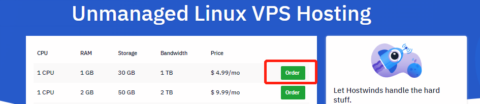 下面我以Unmanaged非托管型VPS为例进行说明,首先打开Hostwinds官网,选择Unmanaged, 1GB – $4.99这款VPS。