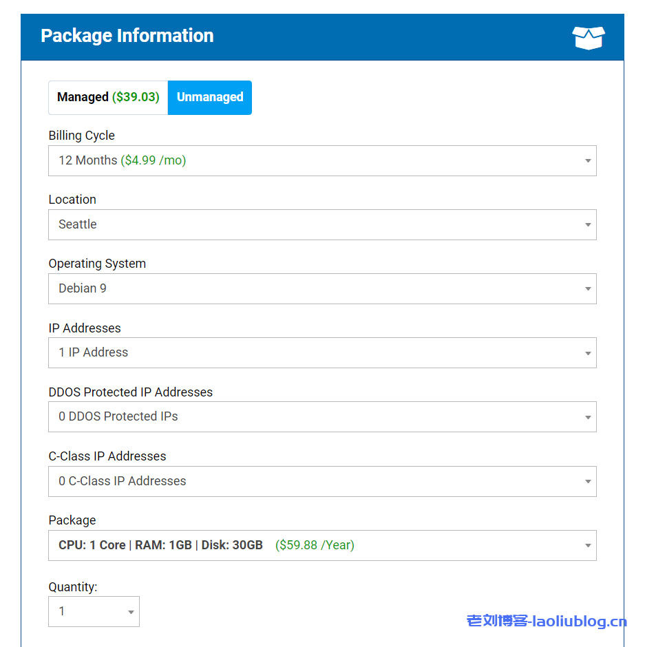 然后,选择并确认信息。确认是Unmanaged非托管型,付款周期(年付/季付/月付),机房(西雅图/SEATTLE),系统为Debian 9(占用内存小,适合建站,也可选CentOS或Ubuntu),确认主机为CPU:1 Core,内存1GB,存储30GB。其他信息默认不需改动: