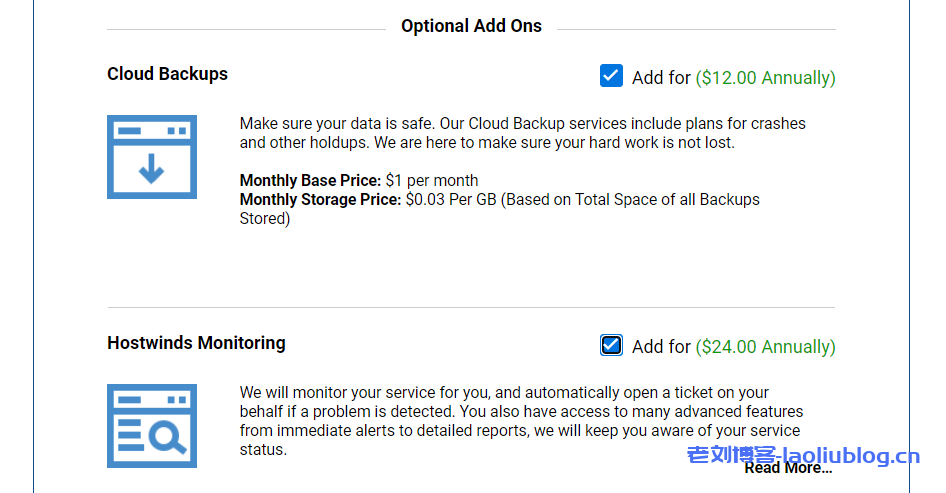 这里有可选功能:云备份和VPS监测提醒,可以根据自己的需求选择: