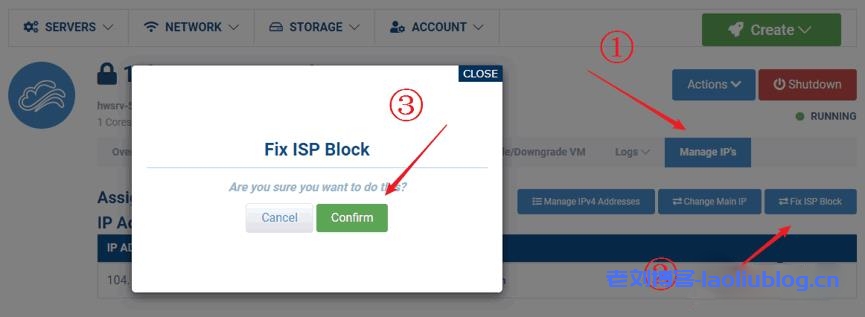 进入VPS管理后台,点击Manage IP’s ,然后点击Fix ISP Block按钮,在弹出的窗口点击确认Confirm。