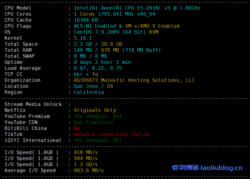 老刘介绍了艾云iaclouds今天刚刚推出的年付88元的双12活动款美国圣何塞VPS【Standard-1212-Special-Plus-San Jose】:#双12#艾云圣何塞VPS:88元/年/1核/1G内存/20G RAID-10 SSD/5TiB流量/2.5Gbps峰值速率/1个IPv4,免费20Gbps DDoS防御,那么这款活动机性能如何?老刘这里入手了一台进行了简单测评,来一起看下其国内延迟、丢包率、性能和带宽、路由去回程、流媒体和TikTok检测情况。