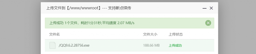 扔个QQ安装包上去,看看文件上传速度2.07MB/s
