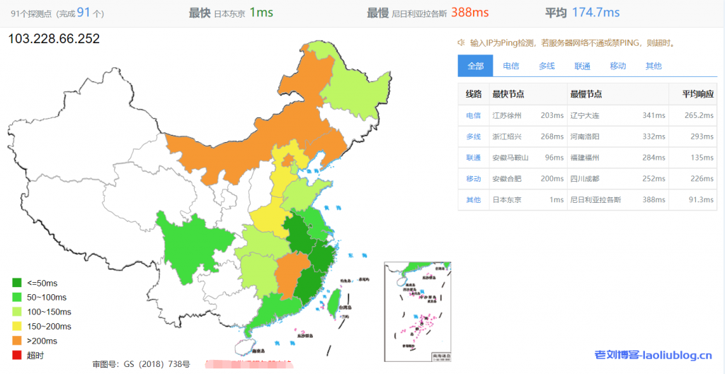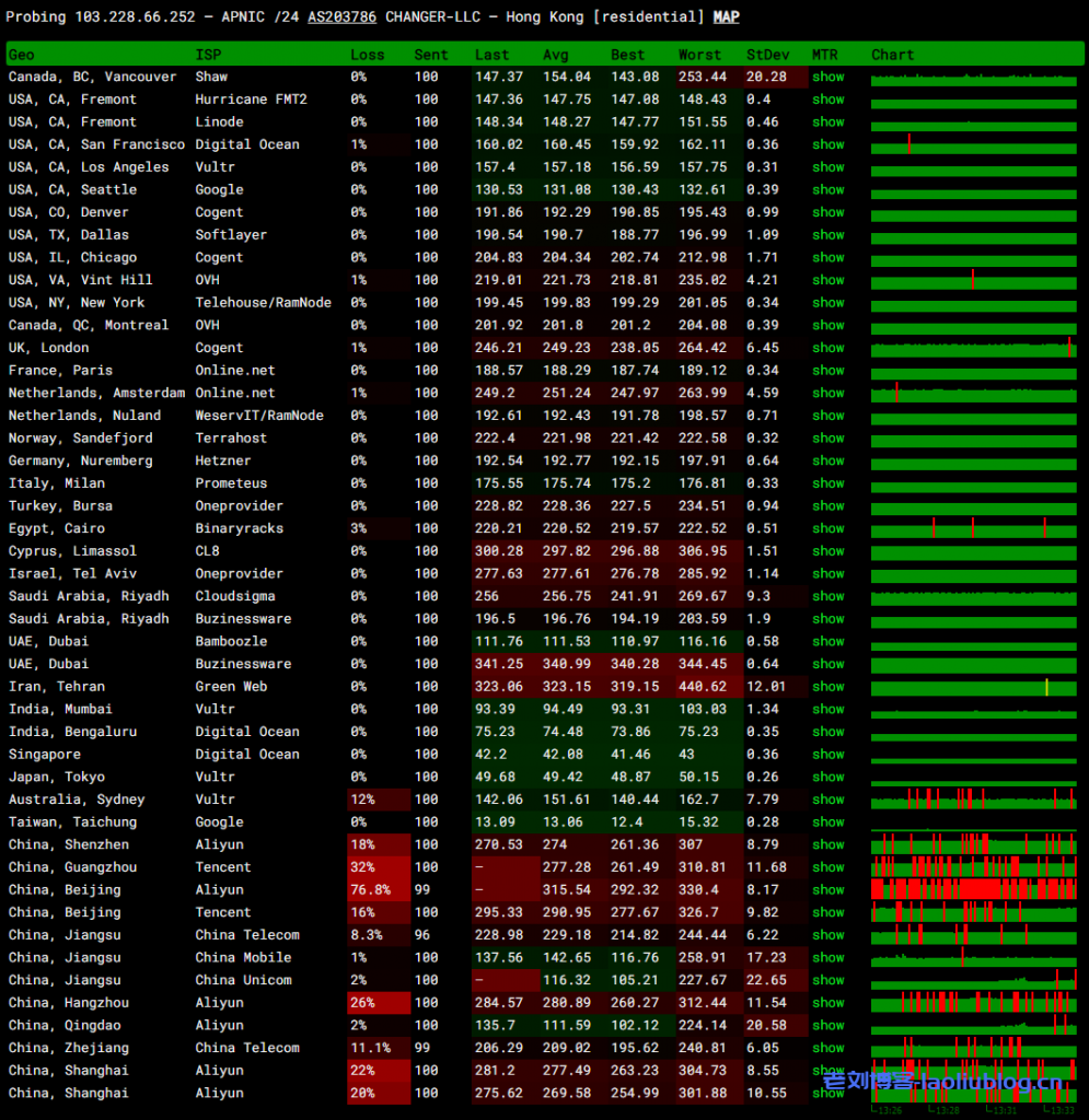 VPS丢包率测试,老刘是国内移动宽带,可见确实对移动用户不友好,对国内联通/CN2优秀