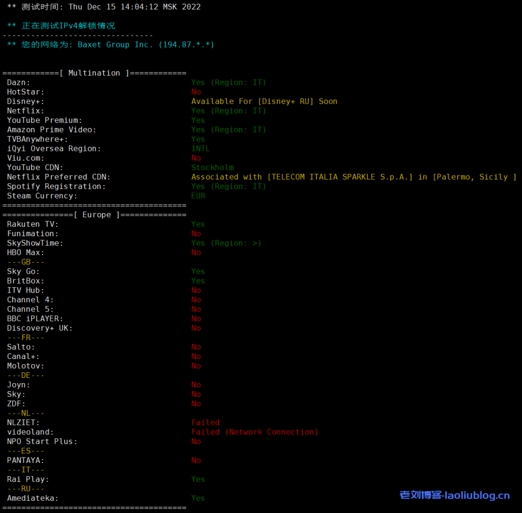 justhost前几天又一口气上新了四个机房,其中就有意大利巴勒莫机房。意大利机房比较冷门,国内用户比较少,原因就是线路一般又没有抗投诉加成之类的,不过多个选择总是好的,反正justhost能随意换机房,还能免费换5次IP,这次老刘就把前几天测试的香港机房切换成意大利机房(IP也换了),这里就测试下justhost意大利vps的性能和大家分享。这台测试机是NVMe硬盘套餐,其他配置和最便宜的HDD硬盘套餐一样,只是硬盘读写速度好很多。总结测评结果来看:意大利原生IPv4+美国原生IPv6,解锁Netflix,三网去程绕美国,电信移动回程直连,移动回程绕美国!