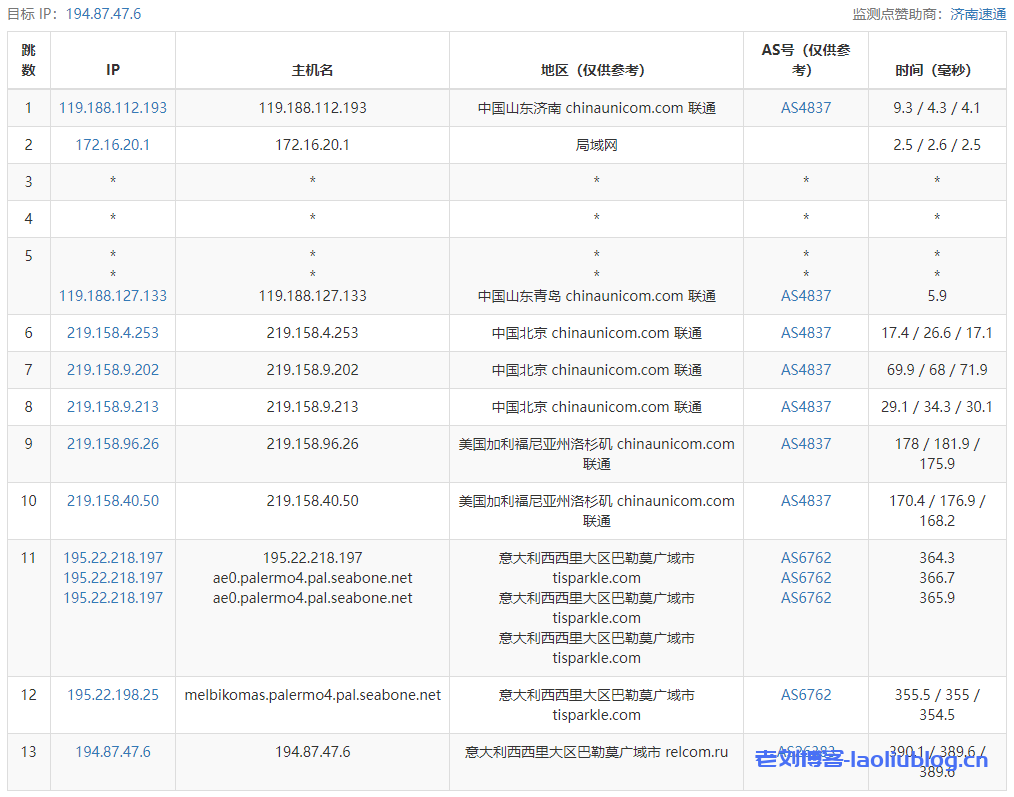 移动回程经过德国算是直连;联通回程经过洛杉矶;移动经过德国直连回程